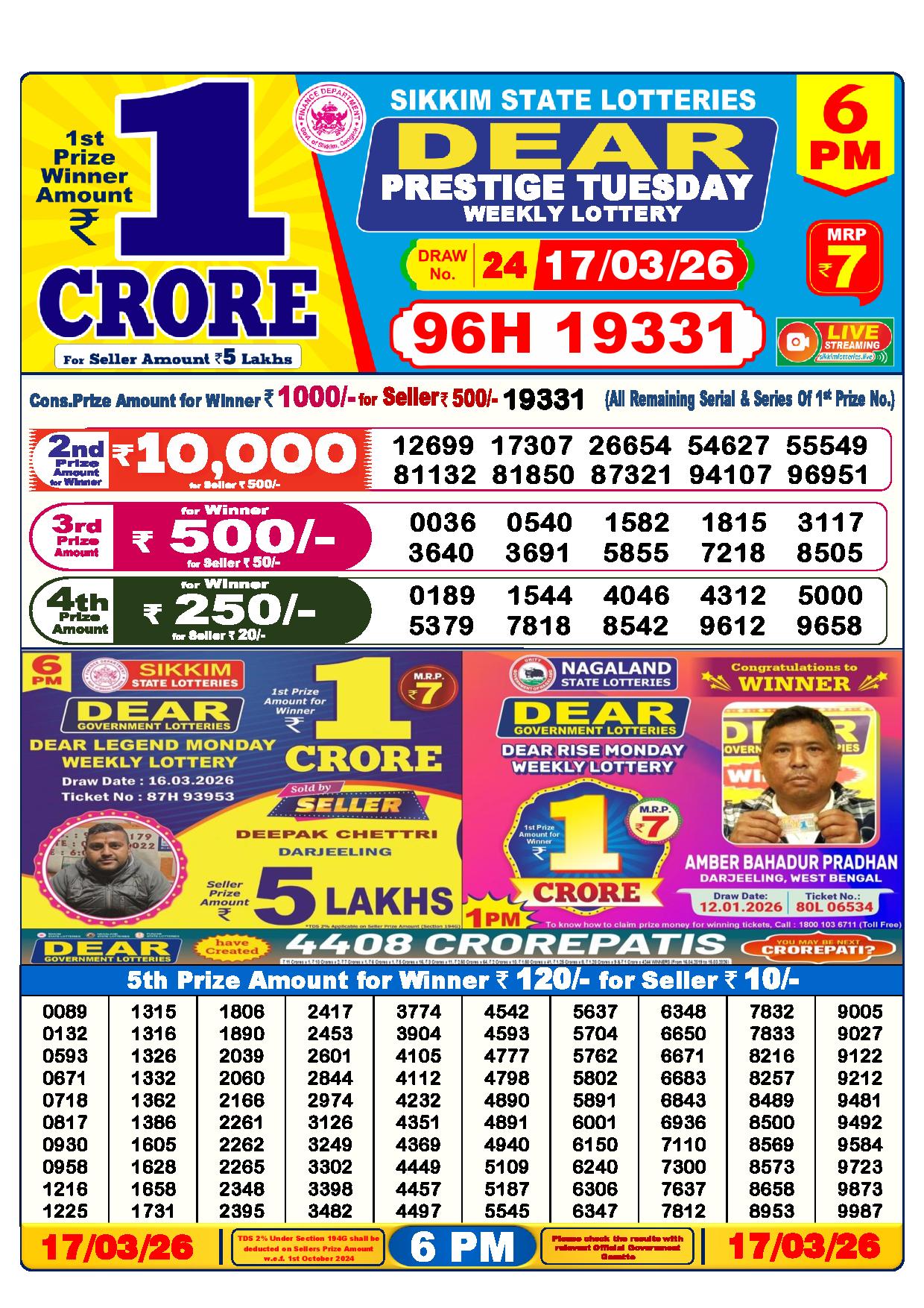 Exciting news! The Nagaland State Lottery Department has just announced the results for the 6 pm Dear Lottery Chart Today Live Sambad. It’s your chance to check if fortune has smiled on you today.