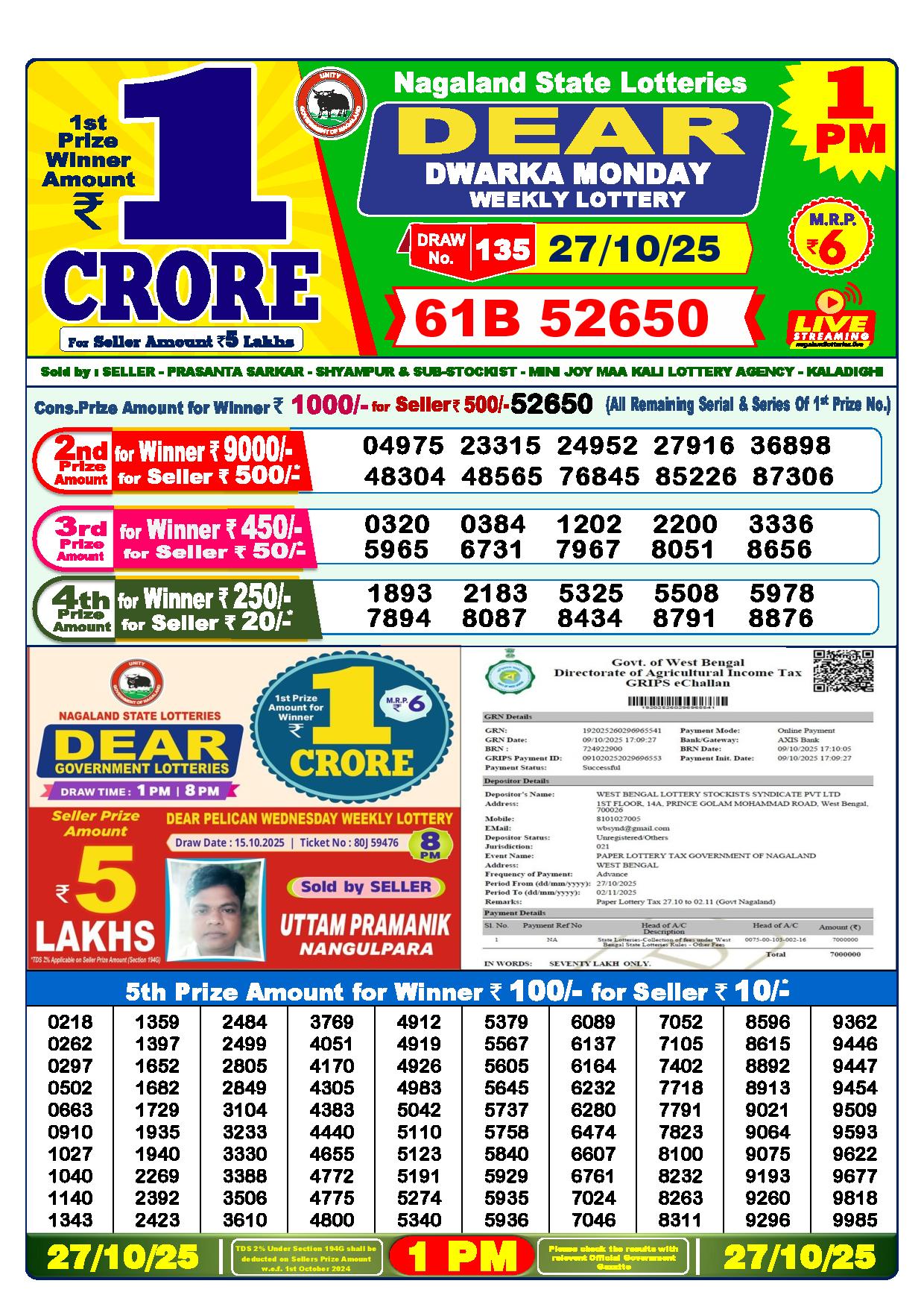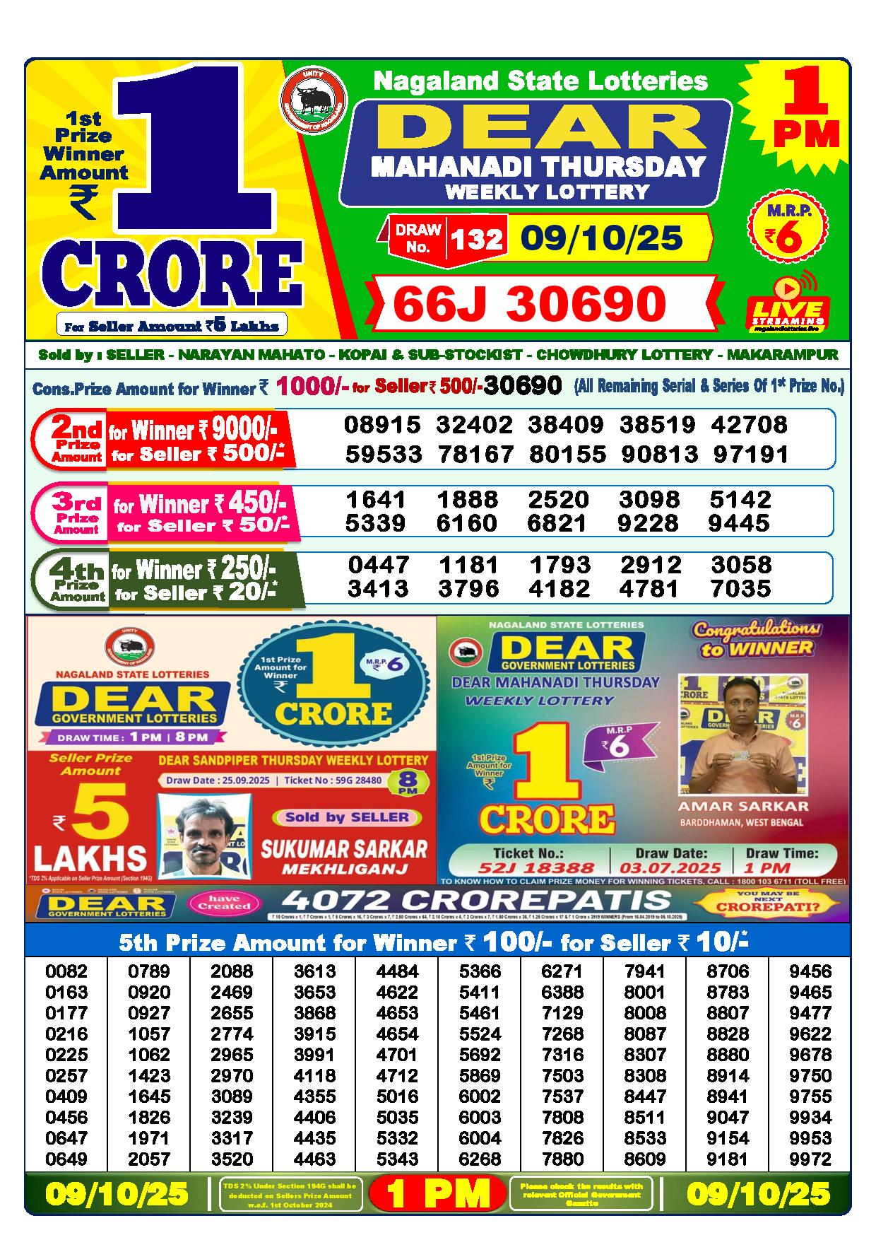 The 1 PM draw has a 1st prize of 1 crore, a 2nd prize of 9000 Rupees, a 3rd prize of 450 Rupees, a 4th prize of 250 Rupees, and a 5th prize of 120 Rupees. The results for today’s 1 PM draw in Nagaland are displayed below.