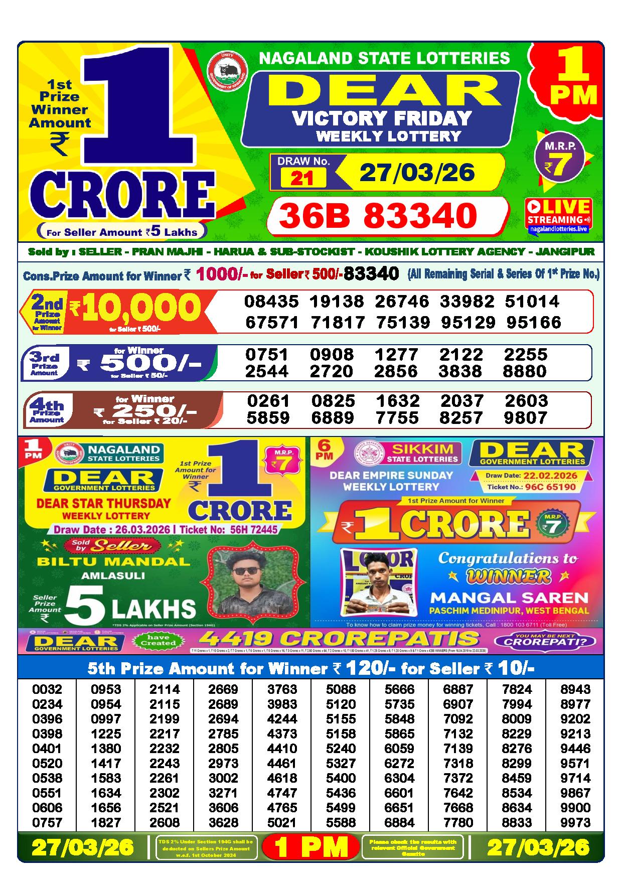 Want to check the dear lottery result for today at 1 PM? You’ve come to the right place! We regularly update the Nagaland State Lottery results, including the morning, night, and evening draws, right on this website every day.