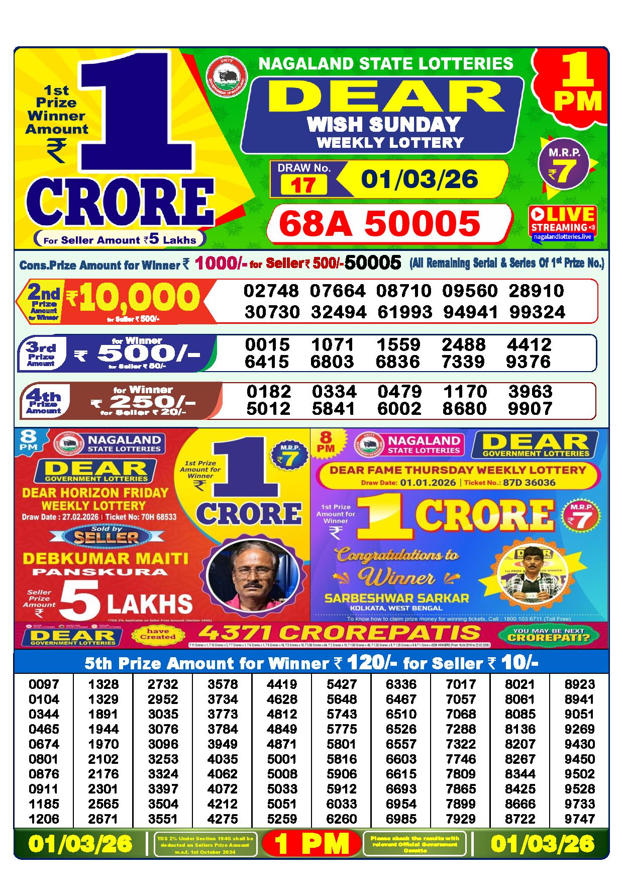 The 1 PM draw has a 1st prize of 1 crore, a 2nd prize of 9000 Rupees, a 3rd prize of 450 Rupees, a 4th prize of 250 Rupees, and a 5th prize of 120 Rupees. The results for today’s 1 PM draw in Nagaland are displayed below.