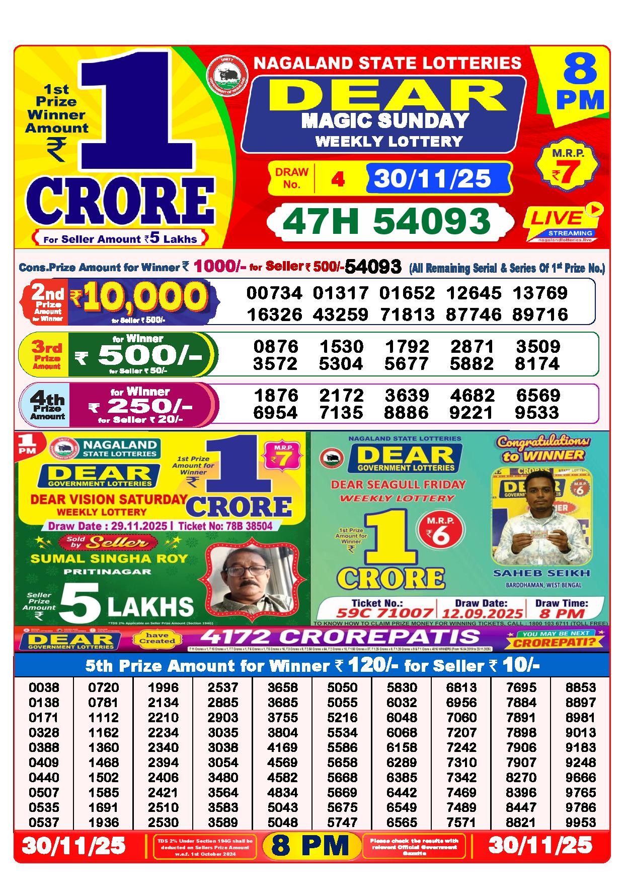 The 8 PM draw offers a 1st prize of 1 crore, a 2nd prize of 9000 Rupees, a 3rd prize of 450 Rupees, a 4th prize of 250 Rupees, and a 5th prize of 120 Rupees. The results for today’s 8 PM draw in Nagaland can be found just below. Simply scroll down to see the outcome.